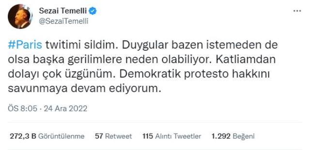 Tepkiler sonrası paylaşımını kaldıran Temelli, "Paris twitimi sildim. Duygular bazen istemeden de olsa başka gerilimlere neden olabiliyor. Katliamdan dolayı çok üzgünüm. Demokratik protesto hakkını savunmaya devam ediyorum" dedi.