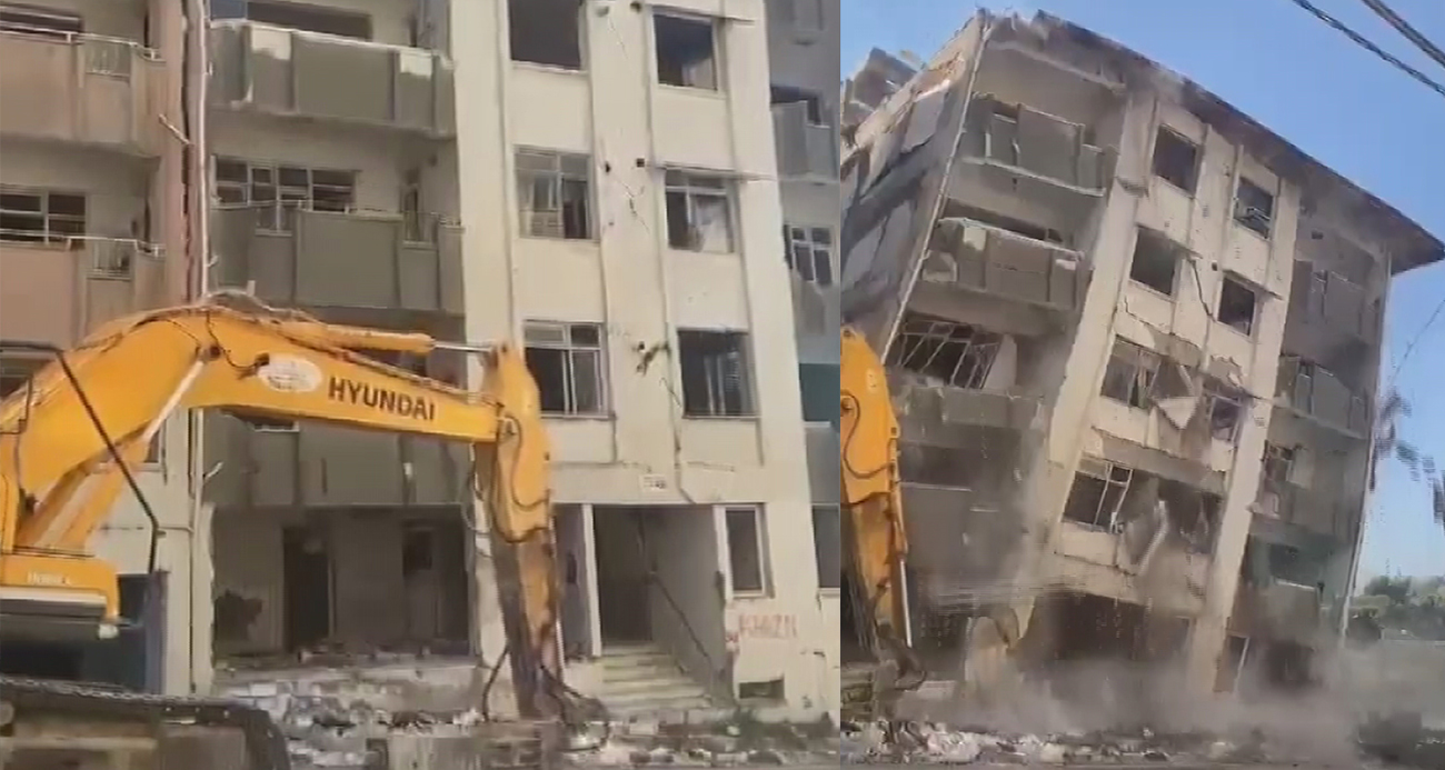 Hatay’da operatör, hasar verdiği 5 katlı binayı kırıcıyı yere vurarak titreşimle yıktı. O anlar cep telefonu kamerasına yansıdı.