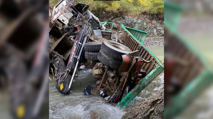 İş makinesi taşıyan kamyon dereye devrildi 1 ölü 1 yaralı
