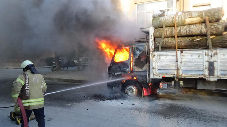 Silivride kütük yüklü kamyon alev alev yandı