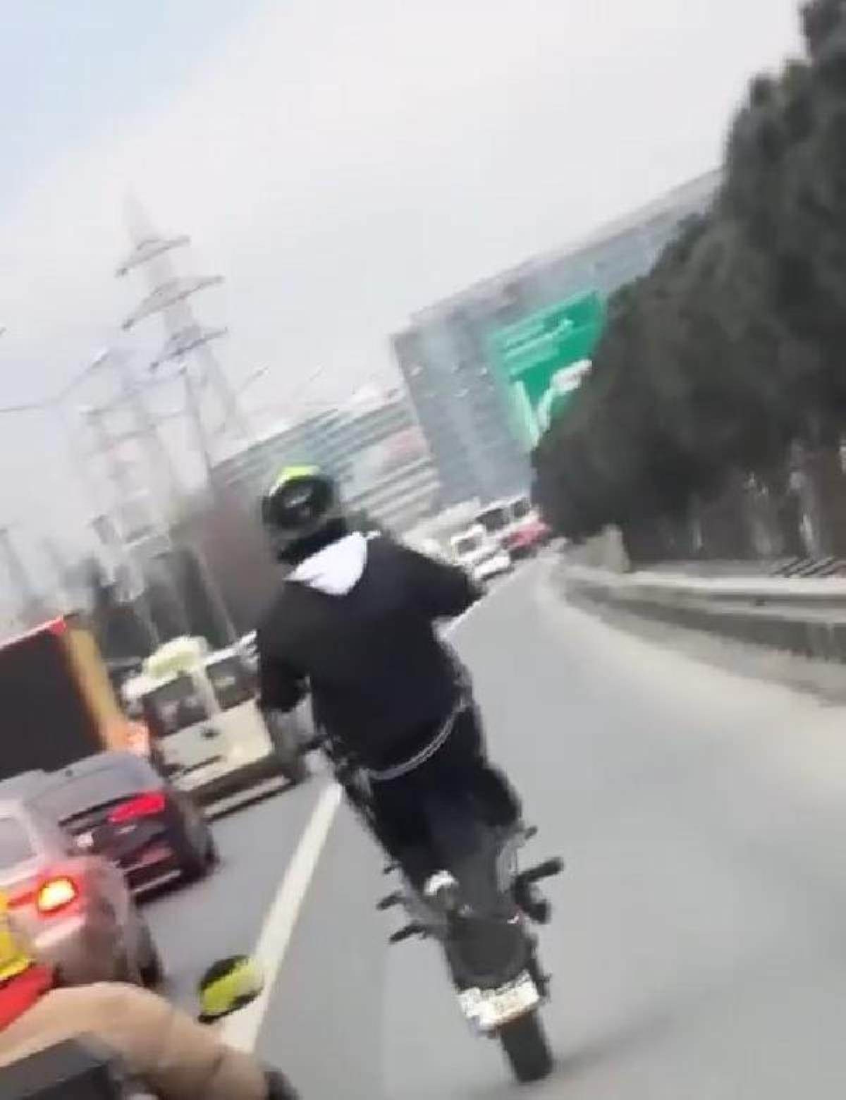 Motosikletlinin tek teker üzerinde tehlikeli yolculuğu