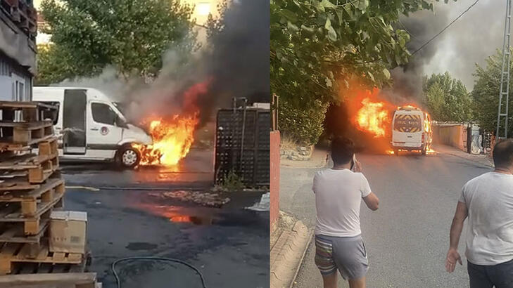 Ümraniyede servis minibüsü alev alev yandı